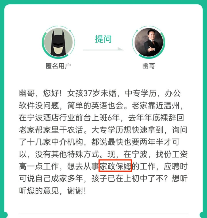 这位37岁的星友,要去做家政,也就是保姆工作,这个确实是已婚已育优先。这属于体力活,不是我们职业经理人的求职方向了。但是这位星友主要做的就是不需要学历的体力活,属于经验密集型的劳动力岗位,下路职业,见《在中国,三种职业道路的选择》。 其实你要再深究,即使足疗和按摩技师,也是单身未婚优先。只不过我们出去足疗碰到的技师,主要是离异、已婚、已育的,因为能出得起的工资招不到那么多单身未婚的大姑娘来入行啊。 差不多了,以上四个步骤,条件从扩散到集中,并用两个例子来作为讨论,大致得出了这个问题“单身能不能谎称已婚已育?”的答案: 能当然能,只是单身未婚尽量不要谎称已婚已育,不但代价高昂、好处极少,而且谎言相当容易戳穿;特例就是你中年人单身未婚时去应聘保姆、保洁、月嫂、育儿师、幼儿教师等岗位时,确实可以适当谎称已婚已育,但是人设和技能你要能维持得住,别穿帮了。 |