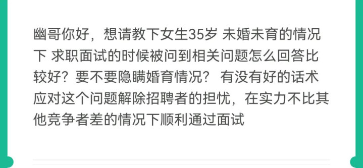 3,【35岁】单身求职时,要不要谎称自己已婚已育? 从资本节约成本的角度来说,单身未婚的员工当然是好于已婚已育的员工。但这只是一个大概率,有没有反例也就是小概率呢?当然是有的。 为了搞清楚这个小概率,我们先看:在求职时已婚已育比单身未婚,强在哪里? 你看某国总统或者某单位的大领导、CEO一胜选,或者在正式场合一出场,会有个环节带领配偶、子女、家人登台,让世人看到此人家庭幸福,堪称大家甚至人类的楷模。这样来印证,说明:已婚已育甚至子孙满堂的人,被推举为大领导时,可以锦上添花。 但我们都是普通人,不大可能做到啥总统、总理的,再说法国总统、英国首相也都曾有过单身的,当然也有带女朋友出席正式场合的。对于我们打工的职业经理人来说,已婚已育的主要好处,绝不是体现在做大领导时候的家庭幸福。而是当你做到总监及以上级别时,已婚已育会是个加分项,见《总监家庭幸福财务自由,为何愿意不远千里去远方打工?》。不过人设可以伪装,所以有人单身、未婚、离异、无娃时去面试,确实会萌生谎称自己已婚已育的想法,完全可以理解。 对于大多数普通职位,比如总监/部长以下的岗位,求职时已婚已育的好处主要是稳定性更强。有了家庭的根基,说明你不会动不动跑路或者跳槽,仅此而已。这几乎是已婚已育人士在求职时,比单身未婚人士多出来的唯一好处。单身未婚比已婚已育的求职者,多出的优势有十来个。两害相权取其轻,两利相权取其重,明显非高管岗位求职时,没有必要谎称已婚已育。 我们看如下提问。